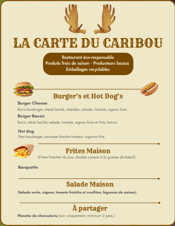Snacking, goûterUn petit creux ? Le Caribou est sur place pour satisfaire vos enviesFOOD CABANE ( Ouvert les mêmes jours que l'accrobranche, à partir de midi ) Restauration sur place ou à emporter Fraicheurs locales, saveurs totales ! Le Caribou vours propose une cuisine salée et sucrée élaborée à partir de produits frais, de saison et issue des productions locales.